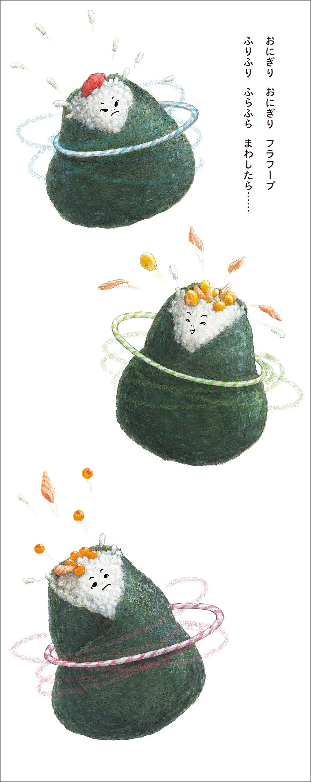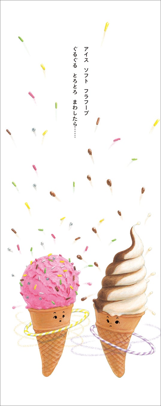 最新作『フラフープ!』は、日本初の「フラフープ」をテーマにした絵本です(弊社調べ)。登場するのは、おにぎりやすいか、アイス、プリン、ケーキなど、子どもたちにおなじみのたべものたち。「おにぎり おにぎり フラフープ!」のかけ声にあわせて、くるくる、ふりふり、フラフープをまわしたら…… 思わず笑ってしまうような奇想天外な展開がつぎつぎ広がります。