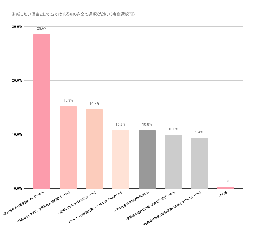 避妊したい理由として、「自分自身が妊娠を望んでいないから(28.6%)」という回答が最も多く、続いて「将来のライフプランを考えた上で妊娠したいから(15.3%)」「結婚してから子づくりをしたいから(14.7%)」など、自身のライフプランを考慮して女性が主体的に子づくりを計画している様子が伺えました。