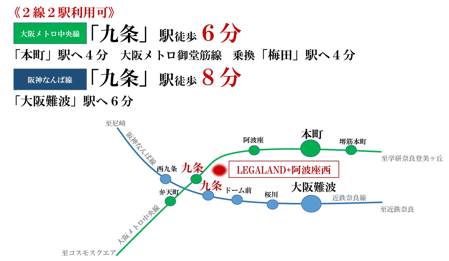 また、最寄り駅である九条駅からは本町・難波といった、オフィスや繫華街へのアクセスも良く、仕事とプライベートの両立が図れます。