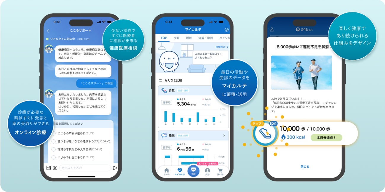 自身の健康情報(=PHR)を集積することによって健康状態の可視化を実現できる「マイカルテ」をはじめ、アプリを日常使いしたくなる仕掛けとして、歩数目標や睡眠記録など定期ミッションを達成するとポイントがもらえる「健康チャレンジ」など、新たな機能を刷新。これらの機能を、誰にとっても使いやすく体験できるデザインを意識し、シンプルさと親しみやすさの両立を目指しました。