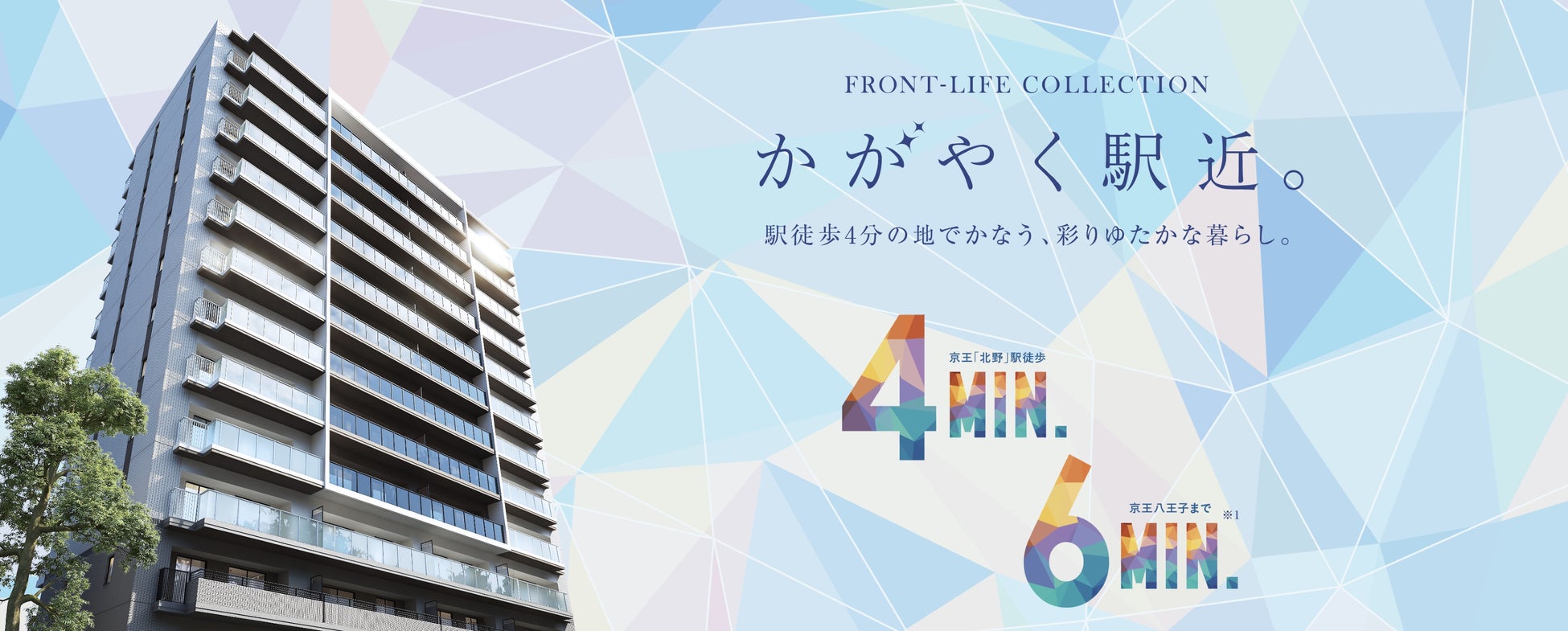 生活利便施設が集まる「北野」駅周辺と、豊富な商業施設が集積する「八王子」エリアが生活圏となる利便性の高いロケーションと、全戸南西向きの明るい開放感が本物件の最大の魅力です。コンセプトの、「FRONT-LIFE COLLECTION かがやく駅近。駅徒歩4分の地でかなう、彩りゆたかな暮らし。」には、駅近を拠点に多彩な暮らし方をかなえるレジデンスをお届けしたいという願いが込められています。