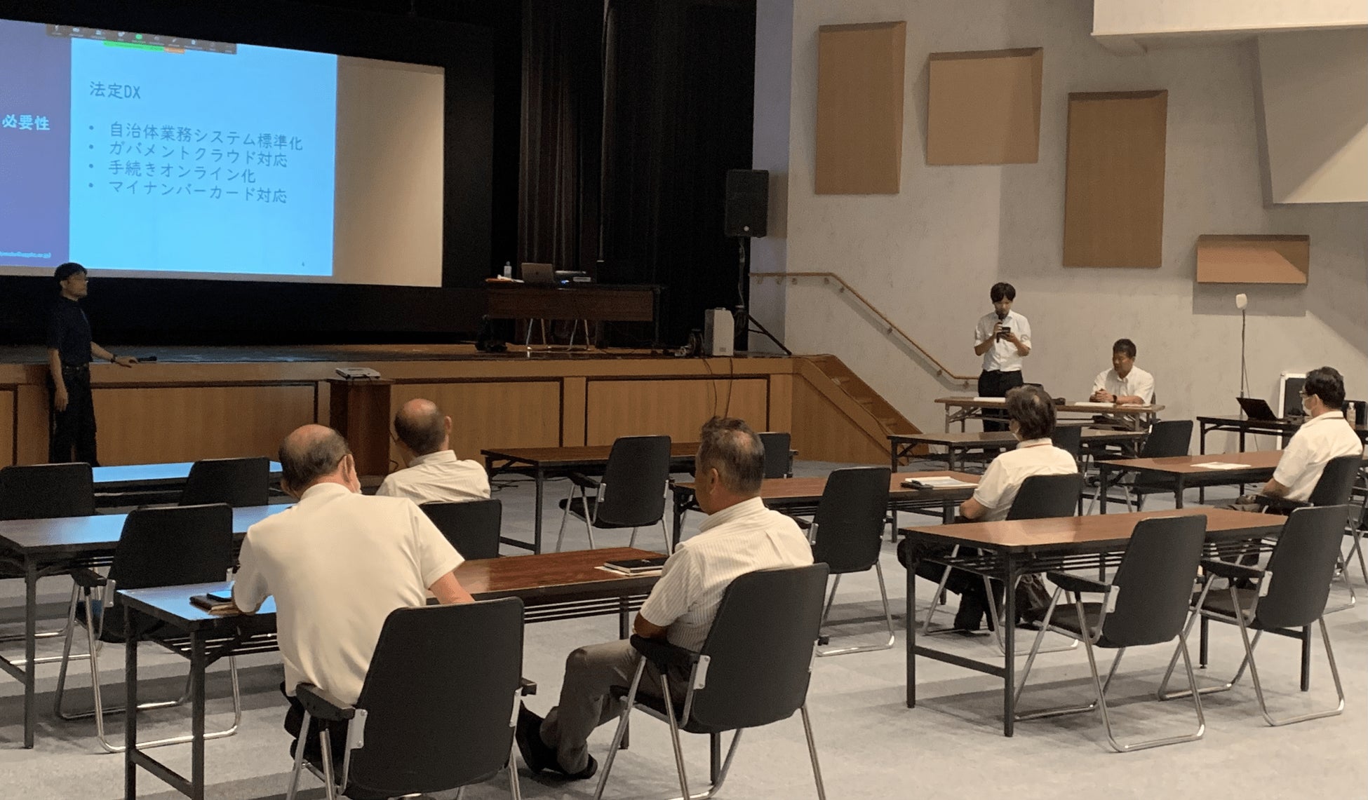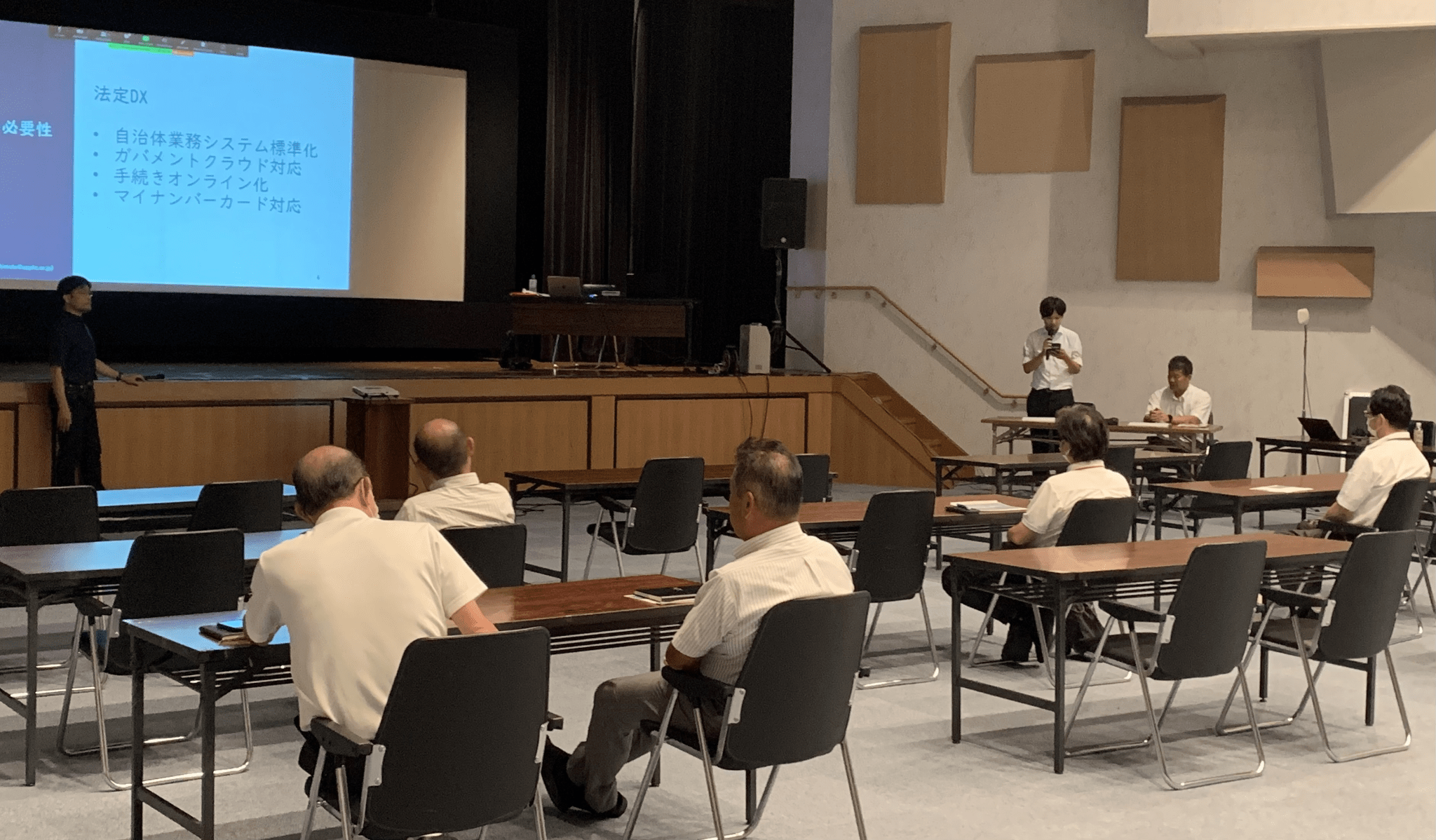 上記内容の勉強会を重ね、2023年8月29日に、経過発表を実施しました。併せて、一般財団法人全国地域情報化推進協会 企画部担当部長 吉本明平氏を、地域情報化アドバイザーとしてお招きし、吉野町からは業務システム標準化対象課幹部職員も参加し、『自治体DXにおける標準化の意義と対応』について講演いただきました。