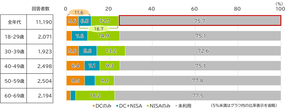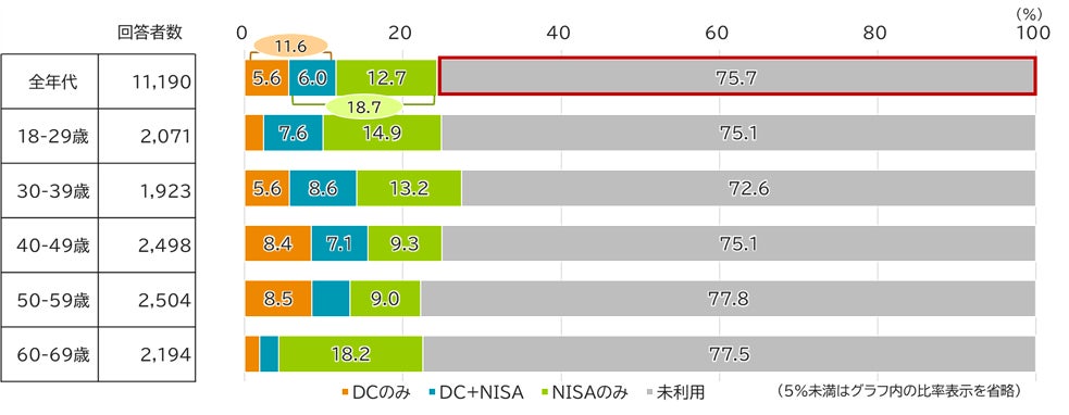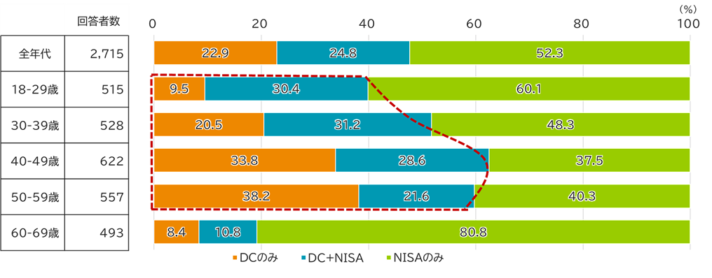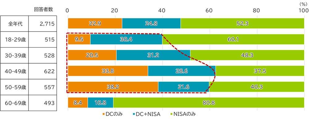 制度利用者の内訳をみると、若年層はNISA制度中心だが、年齢が上がるに従いDC制度の活用割合が上がっている。また、両制度を併用している割合は24.8%だが、30歳代までの若年層では3割を越えている