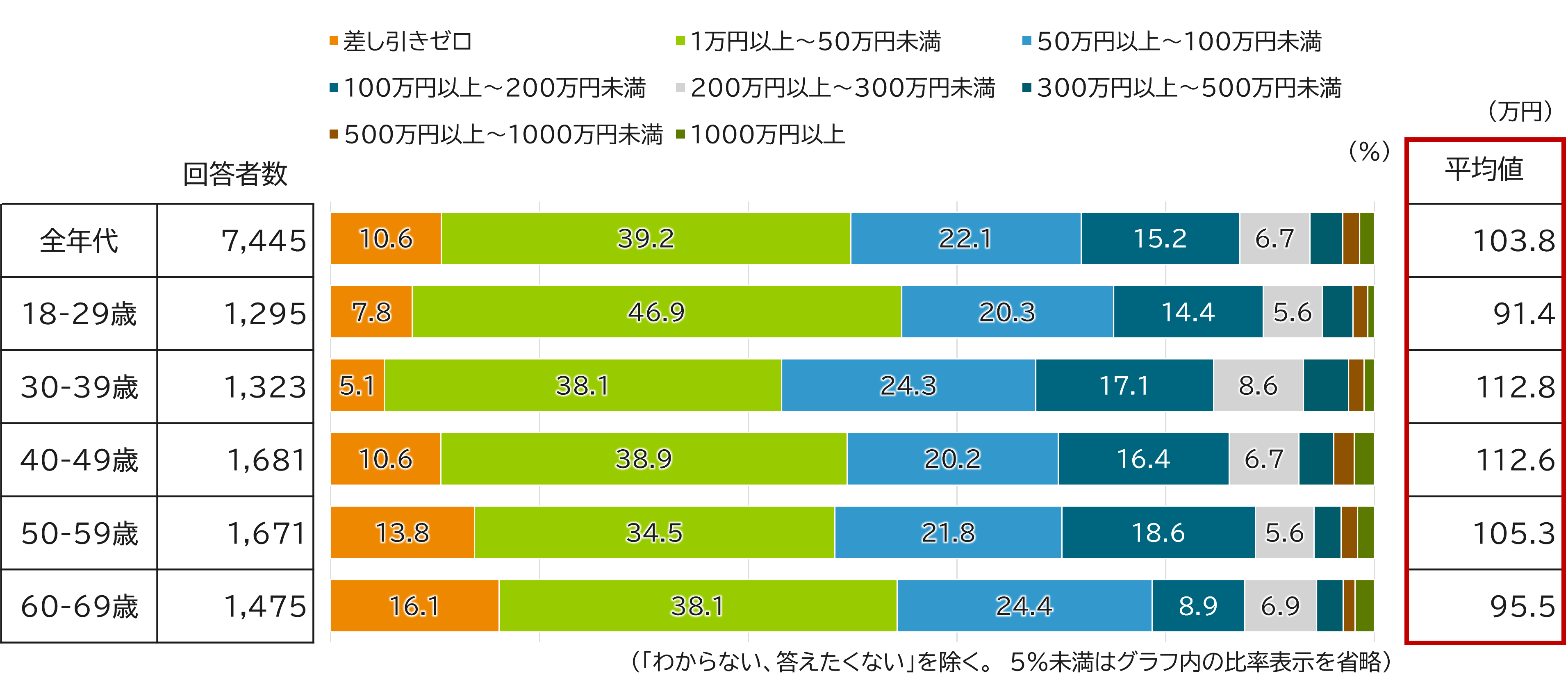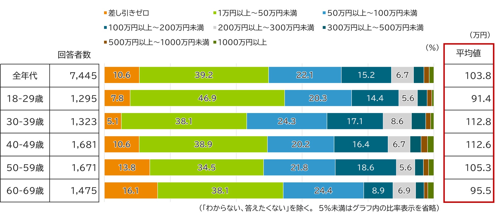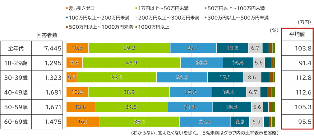 では、資産形成に取り組んでいる人の資産形成額はどうでしょうか。【図表2】では、資産形成に何かしら取り組んでいると回答した人の年間の資産形成額を示しています。どの年代を見ても、「1万円~50万円」の回答割合が多いようです。また、平均金額は103.8万円となりました。