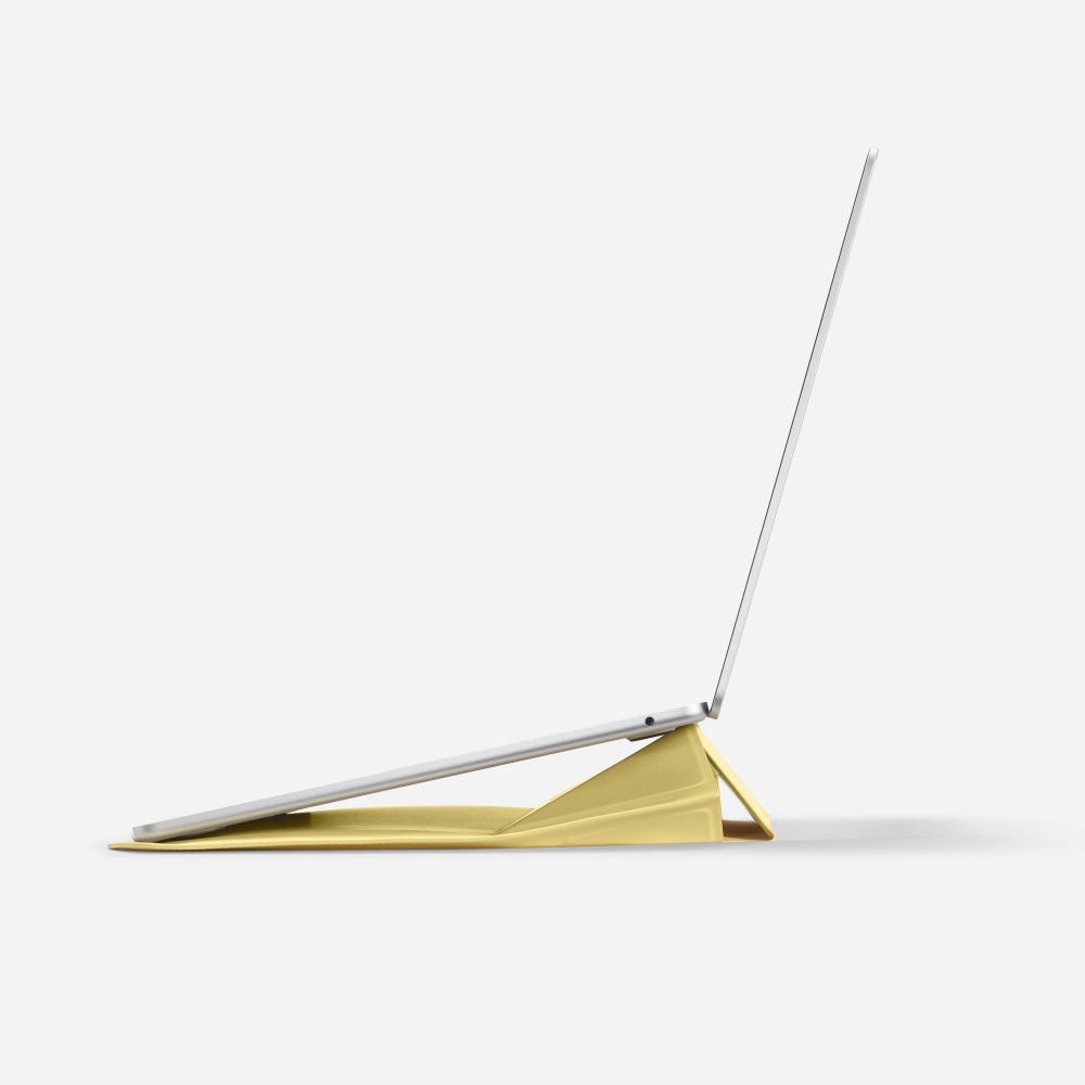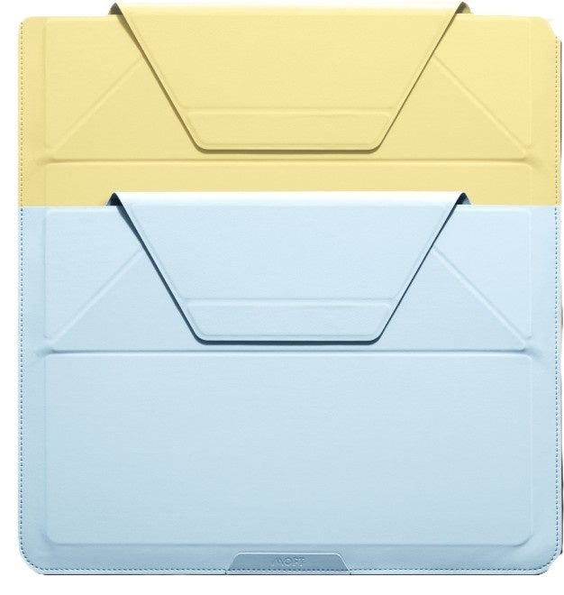 プリンイエロー、ミストブルーの2色が登場。PCスタンドとケースが一体となり、用途に応じて角度調整が可能なため、突発的な作業にも柔軟に対応できます。機能性だけでなく、日常の作業環境に彩りを添える淡いカラーデザインも魅力です。