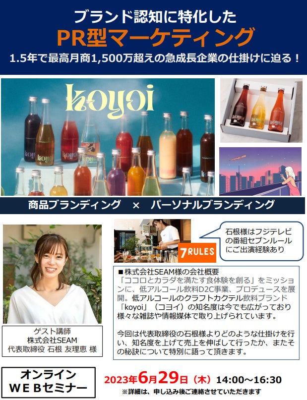 今回セミナーでご講演いただいた株式会社SEAM 様(https://koyoi.jp/shop)は、「ココロとカラダを満たす食体験を創る」をミッショ ンに、低アルコール飲料D2C事業、プロデュースを展開しています。低アルコールのクラフトカクテル飲料ブランド 「koyoi」(コヨイ)の知名度は今でも広がっており 様々な雑誌や情報媒体で取り上げられています。