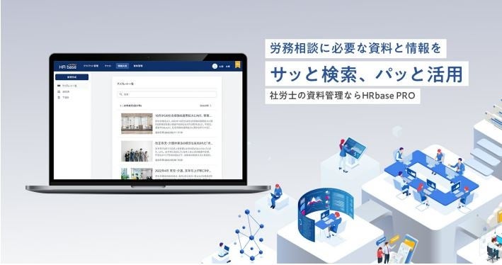 2021年にリリースした社会保険労務⼠のためのクラウドツール『HRbase PRO』は、労務相談の品質向上および効率化を⽬的とし、システム内で労務相談や情報提供の完結が可能です。また、社労⼠が⽇常的に使⽤する書式や厚⽣労働省の公的資料等がクラウド上に⼤量ストックされており、根拠調査や資料作成の⼿間を省ける機能を搭載しています。