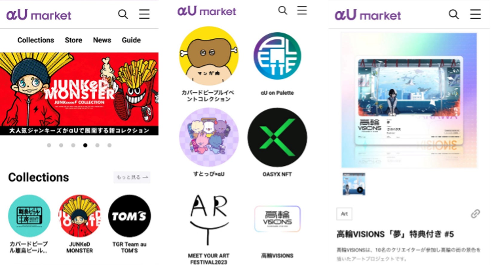 有名アーティストやクリエイターとコラボした NFT や、持っていると特典が受けられる NFT など、幅広いラインアップを展開しています。また決済にはクレジットカードや au かんたん決済が利用できるため、暗号資産を保有していない方もご購入いただけます。