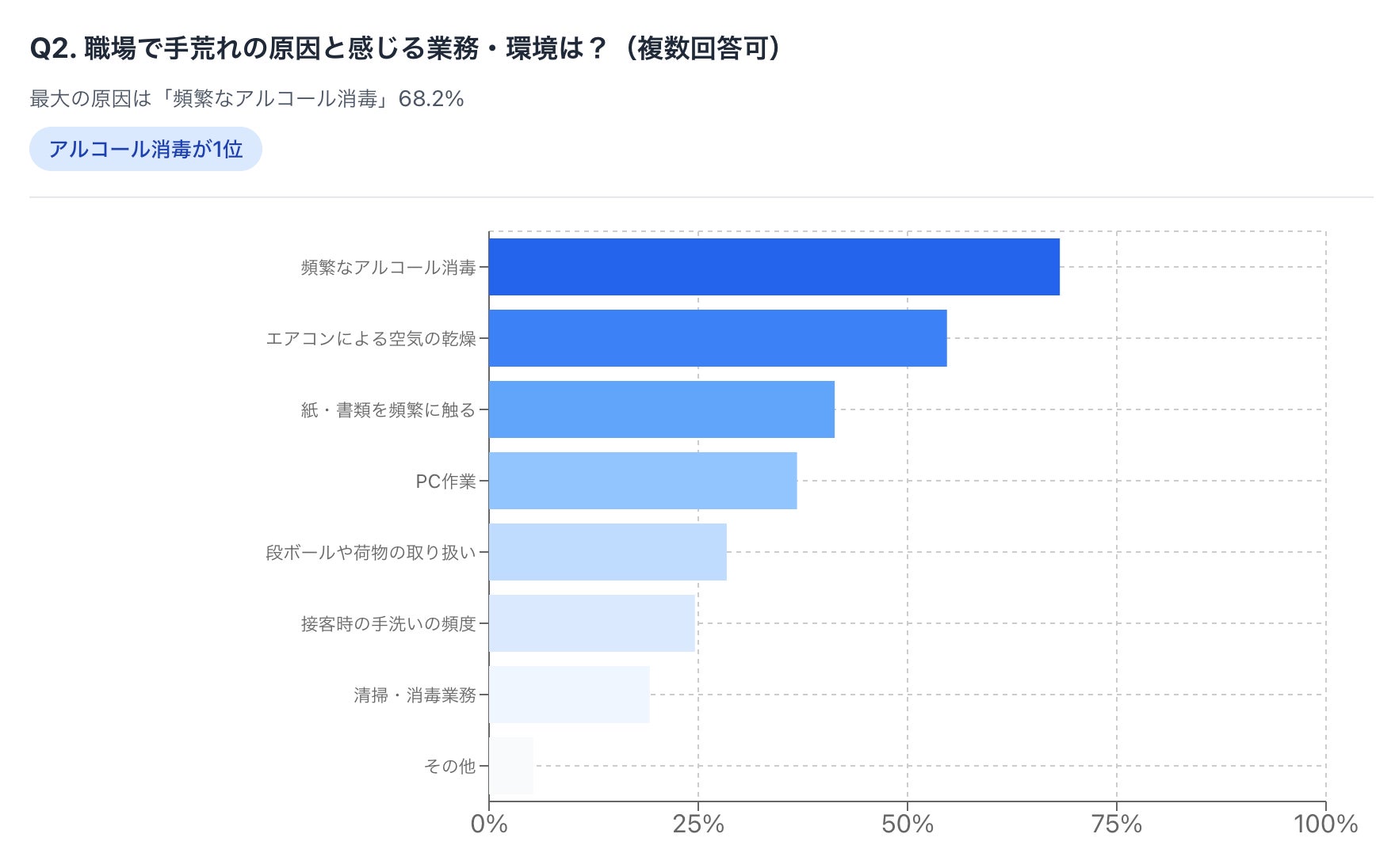 最も多かったのは「頻繁なアルコール消毒」(68.2%)で、次いで「エアコンによる空気の乾燥」(54.7%)、「紙・書類を頻繁に触る」(41.3%)という結果になりました。
