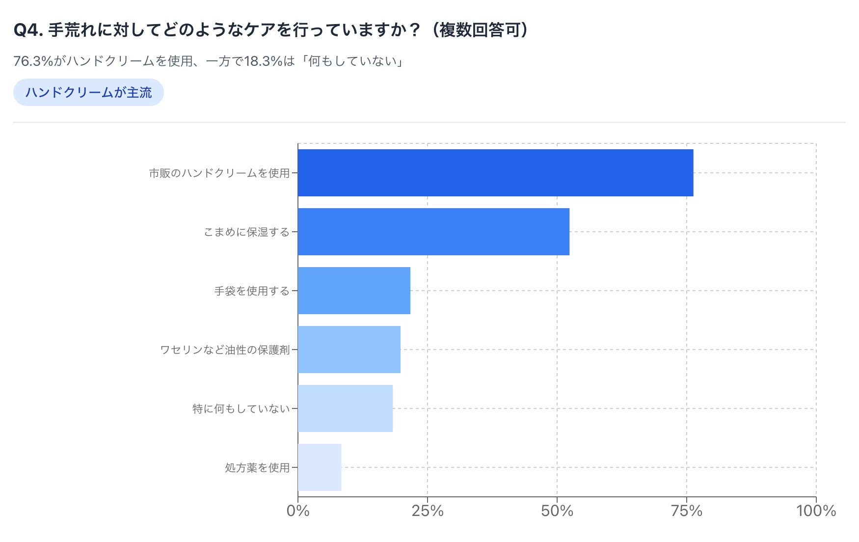 最も多かったのは「市販のハンドクリームを使用」(76.3%)で、次いで「こまめに保湿する」(52.4%)、「手袋を使用する」(21.7%)という結果になりました。