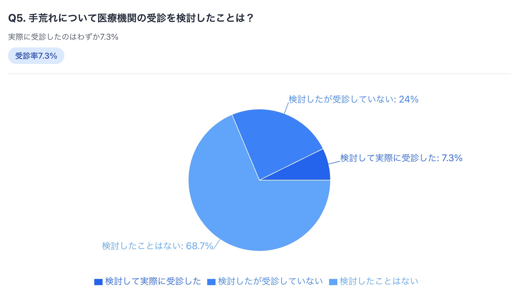 「検討して実際に受診した」(7.3%)と「検討したが受診していない」(24.0%)を合わせると31.3%が医療機関の受診を検討した経験があることが分かりました。
