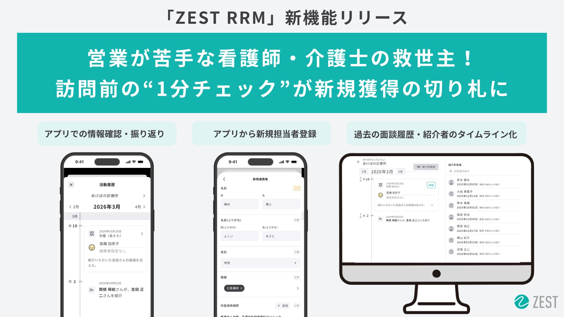 ゼスト、在宅医療・介護向け営業DXクラウド「ZEST RRM」新機能リリース営業が苦手な看護師・介護士の救世主!訪問前の“1分チェック”が新規獲得の切り札に