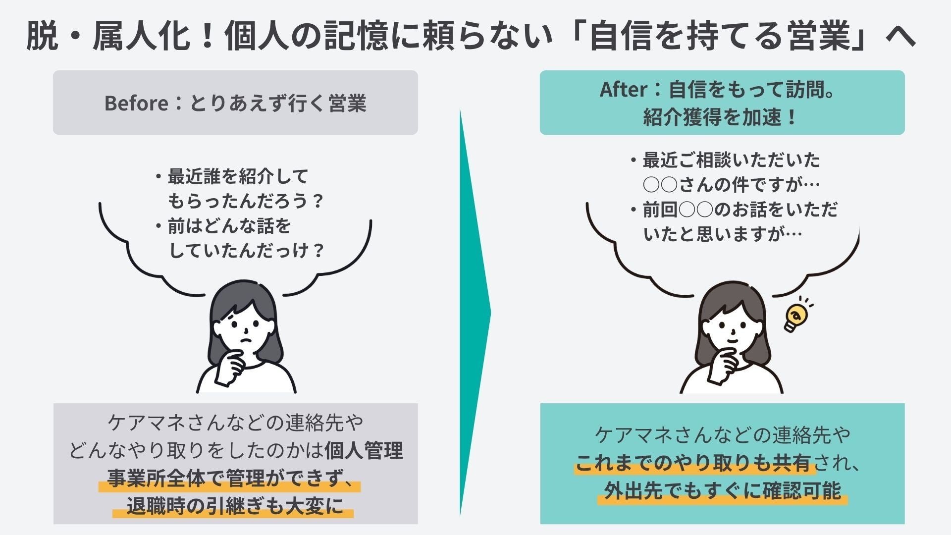 しかし、現場の多くのスタッフはケアの知識は豊富でも営業経験が少なく、「訪問時に何を話せばいいか分からない」「前回誰を紹介してもらったかパッと思い出せない」といった悩みを抱えています。結果として、ただチラシを置いてくるだけに終始してしまったり、相手の信頼獲得に繋がらず、せっかく営業活動をしても成果につながりにくい現状があります。