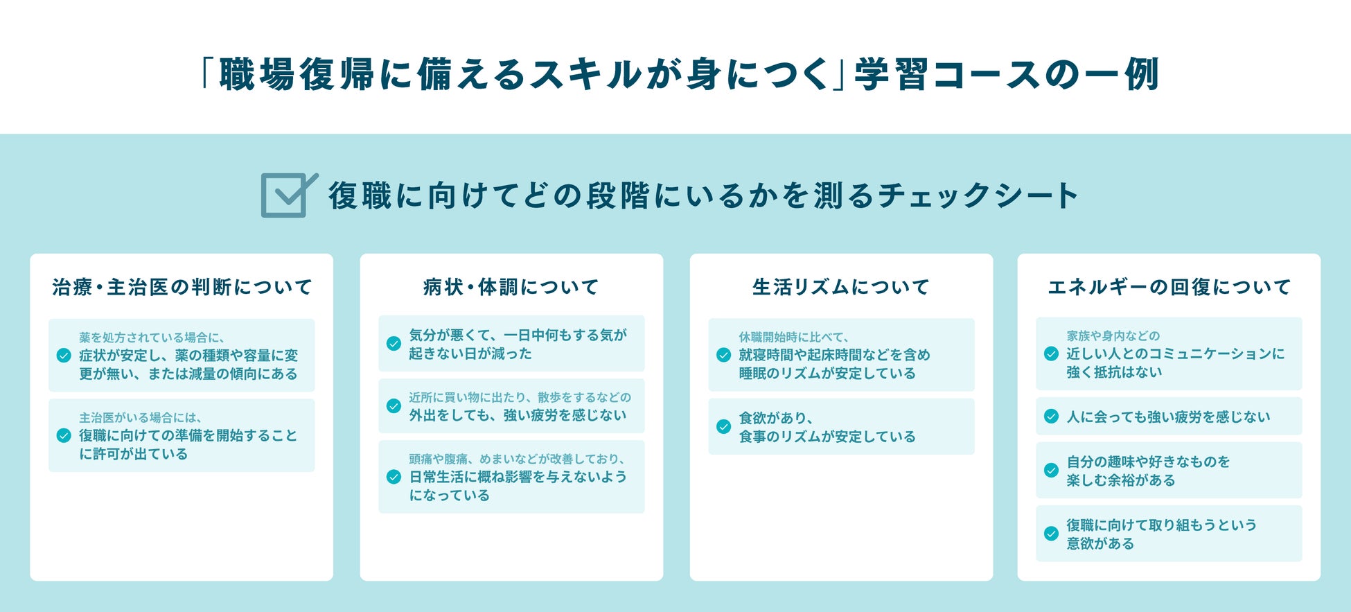 この新しい学習コースは、復職を目指す方々に復職に必要な知識やスキルを事前に学ぶことで、不安を少しでも和らげ、安心して休職から復職へ進むサポートになります。また、復職後も無理なく体調と仕事のバランスを取りながら働き続けるための知識やスキルを学べます。