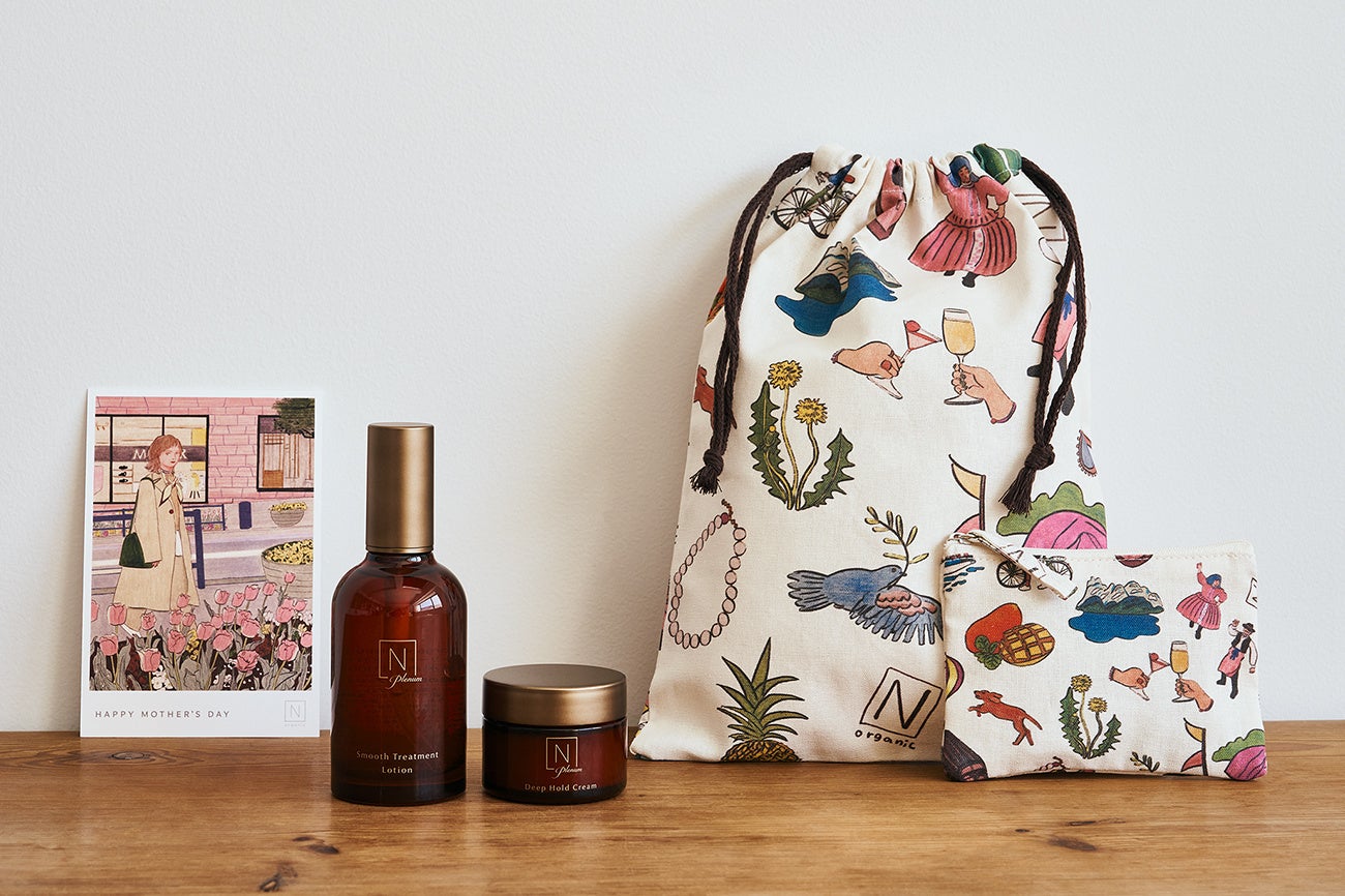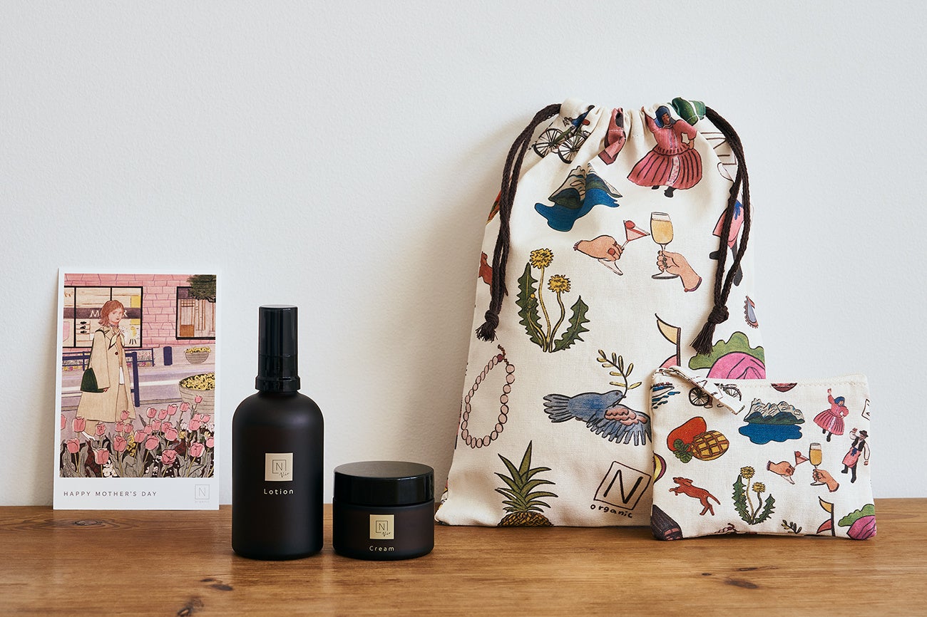 毎年ご好評をいただいている「N organic」の母の日限定ギフト。今年は「母の日を、希望の日に」というテーマを元に、2024年3月21日(木)よりイラストレーターの原倫子さん描き下ろしのイラストがデザインされた巾着・ポーチと商品がセットになったギフトを発売いたします。
