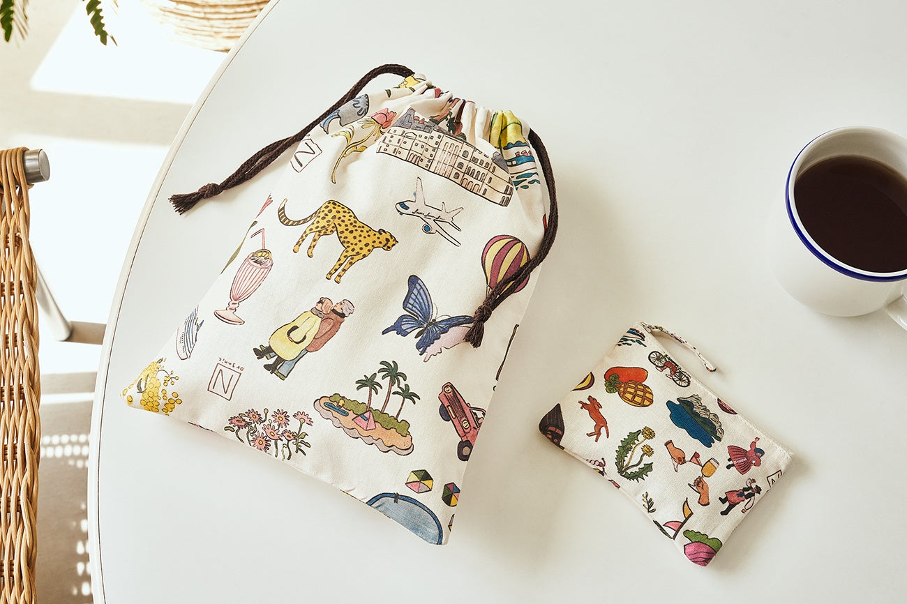 雑誌「&Premium」の表紙イラストレーションも手がけるイラストレーター、 原倫子さん描き下ろしのN organic 母の日2024 特別デザイン。母とこの先見たい景色 Future Memoryをデザインコンセプトに心がときめくような異国のモチーフが散りばめられたデザインの巾着・ポーチの2種をセットにして販売いたします。