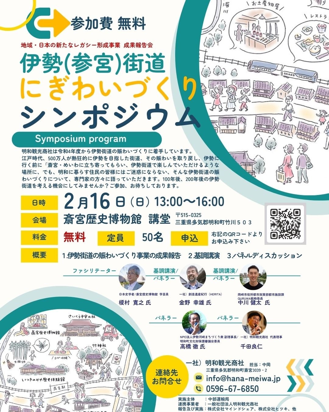 明和町の観光地域づくりを推進する一般社団法人明和観光商社(本社:三重県多気郡明和町、以下明和観光商社)は、令和4年より、伊勢街道のにぎわいづくりに取り組んでいます。この度、令和6年度の取り組みの成果報告として、伊勢街道にぎわいづくりシンポジウムを実施いたします。今年は、施設ごとの概略設計とファンド組成可能性調査、事業計画書の作成を行いました。併せてシンポジウムでは、歴史的資源を活用したまちづくり、ウォーカブルな(歩きたくなる)まちづくりについての基調講演も行います。