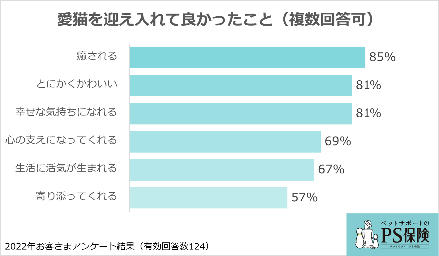 猫の飼い主に、愛猫を迎え入れて良かったことをたずねたところ、1位は「癒される」(85%)、2位「とにかくかわいい」「幸せな気持ちになれる」(共に81%)でした。これらは、猫の見た目やしぐさなど、飼い主が猫から受ける印象が大きいと思われます。