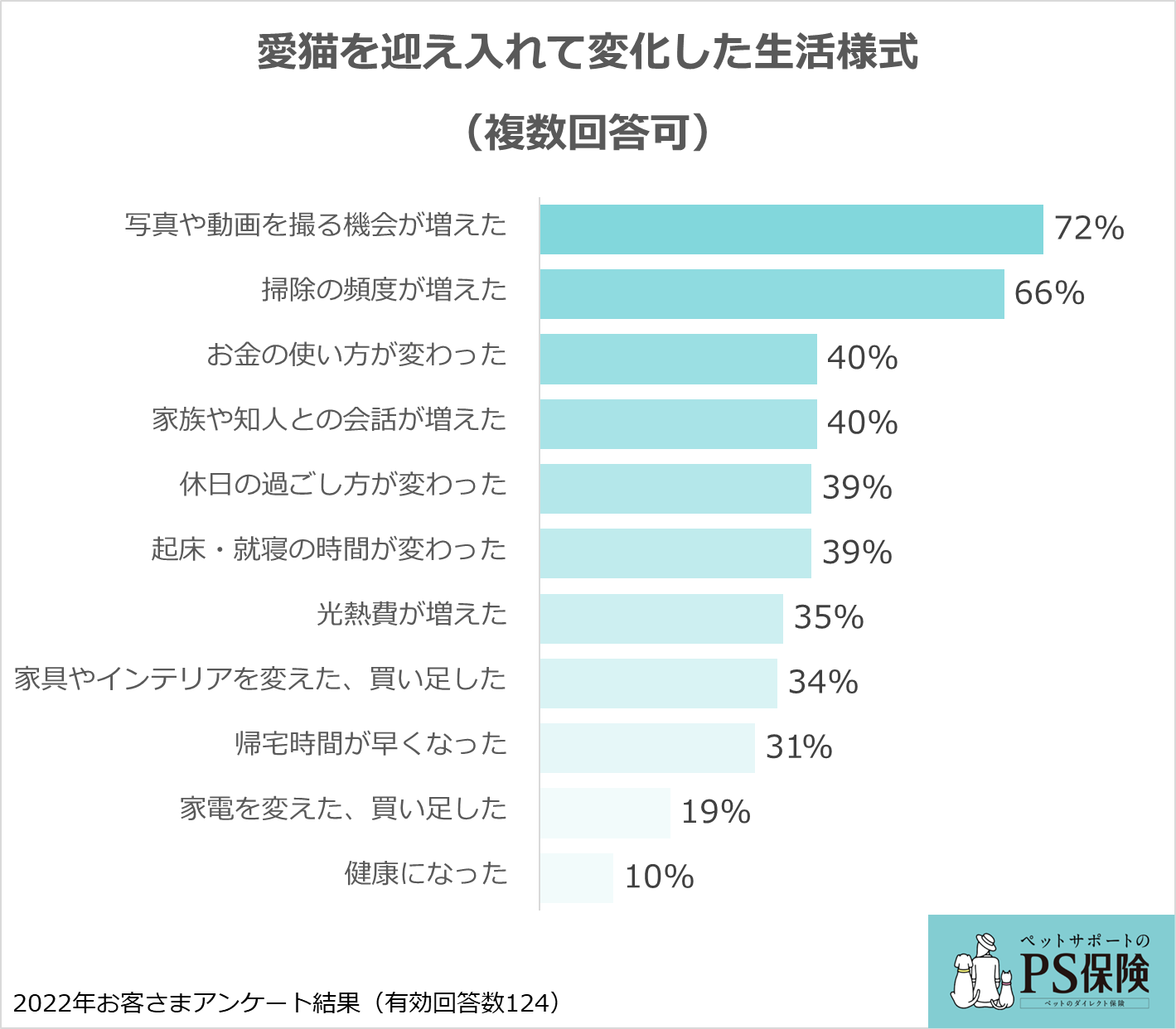 また、「家族や知人との会話が増えた」(40%)、「休日の過ごし方が変わった」「起床・就寝の時間が変わった」(39%)、「帰宅時間が早くなった」(31%)のように、愛猫の存在が飼い主の時間の使い方に変化をもたらしたことがわかりました。