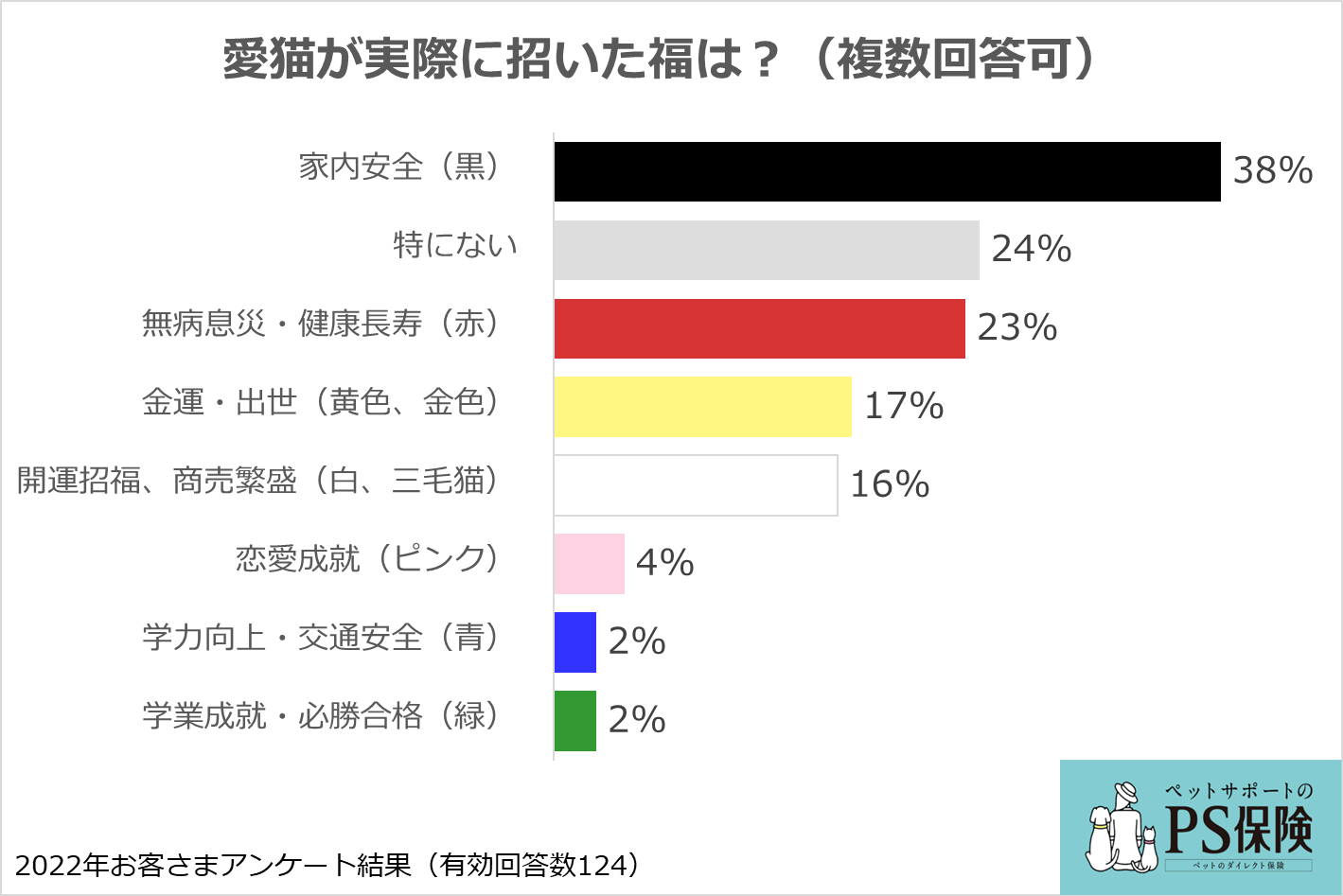 ペット保険の「PS保険」を提供する少額短期保険会社のペットメディカルサポート株式会社(本社:東京都港区赤坂、代表取締役社長:米満 明仁、以下『ペットメディカルサポート』)は、当社ペット保険「PS保険」のご契約者さまで、猫の飼い主さま124名を対象に愛猫が招いてくれた福についてのアンケート調査を行いました。