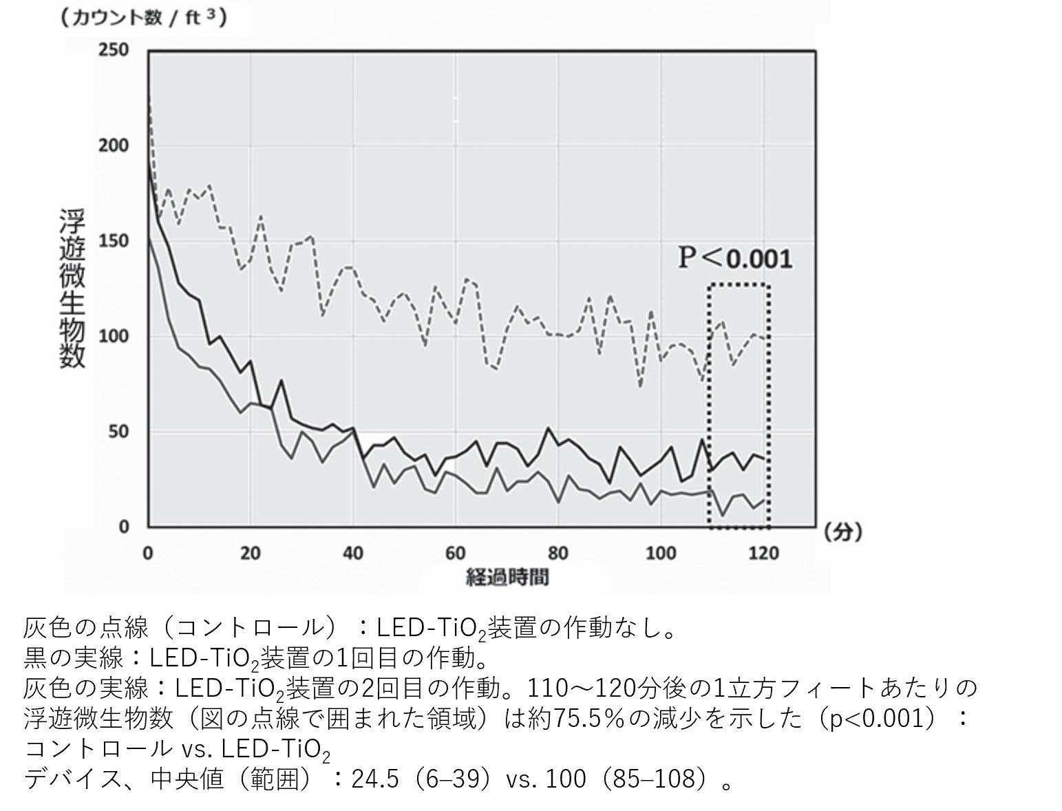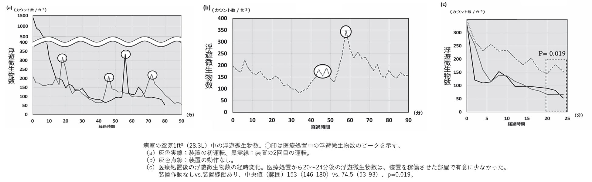 また、患者在室中の病室では、装置動作の有無に係わらず、患者が病室にいる間の浮遊微生物数は医療処置中に増加するが、装置の作動により、空気中浮遊微生物数は医療処置後に急速減少しました(下図)。
