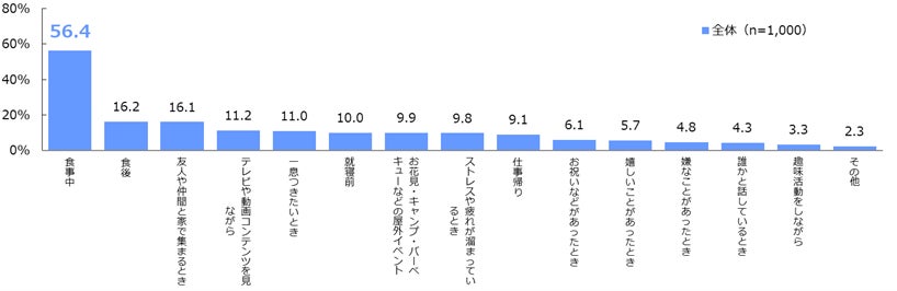 実際の「無糖チューハイ」飲用シーンを調査すると「食事中」(56.4%)が突出した1位になりましたが、2位は「食後」(16.2%)、3位は「友人や仲間と家で集まるとき」(16.1%)となりました。さらに「テレビや動画コンテンツを見ながら」(11.2%)、「一息つきたいとき」(11.0%)といった食事関連のシーン以外でも飲用されており、オールラウンダーなお酒として楽しまれていることが分かりました。[図7]