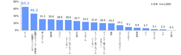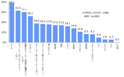 また1杯目にいずれかビール類(「ビール」「発泡酒」「第三のビール」)を飲用する方に限定しても、「無糖のチューハイ(商品名に無糖が入っている)」(30.1%)は、ハイボール(4位:26.1%)より上位の3位となり、飲酒の中盤以降の定番の一つとして「無糖チューハイ」が選択されていることが判明しました[図11]。