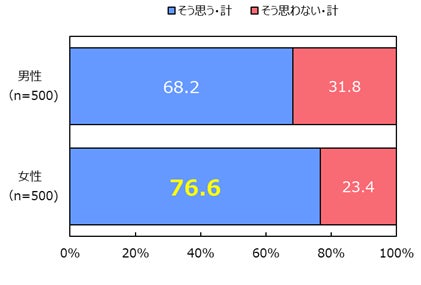 「無糖チューハイ」飲用者の72.4%(※7)が「無糖チューハイ」の流行を実感していました[図8]。また性別でみると、男性(68.2%)より女性(76.6%)が8pt高く、女性のほうがより強く「無糖チューハイ」の流行りを感じていることがわかります。[図9]