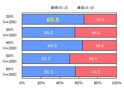 さらに、今回「無糖チューハイ」飲用経験者1,000名に対して飲用実態を調査した結果、58.5%(※6)が 『「無糖チューハイ」の飲用機会が増加した』と回答しました。特に20代の若年層においては65.5%と飲用機会の増加が顕著に見られました。[図3] [図4]