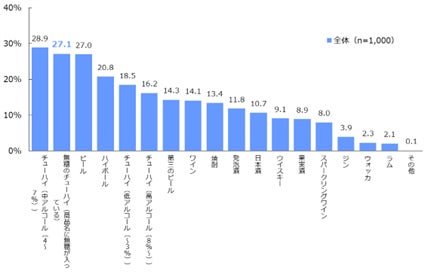 2杯目以降に飲まれるお酒の上位3位は「チューハイ(中アルコール(4~7%)」(28.9%)、「無糖のチューハイ(商品名に無糖が入っている)」(27.1%)、「ビール」(27.0%)でした。「無糖チューハイ」は3位の「ビール」や4位の「ハイボール」(20.8%)を上回り、2位にランクインしています[図10]。