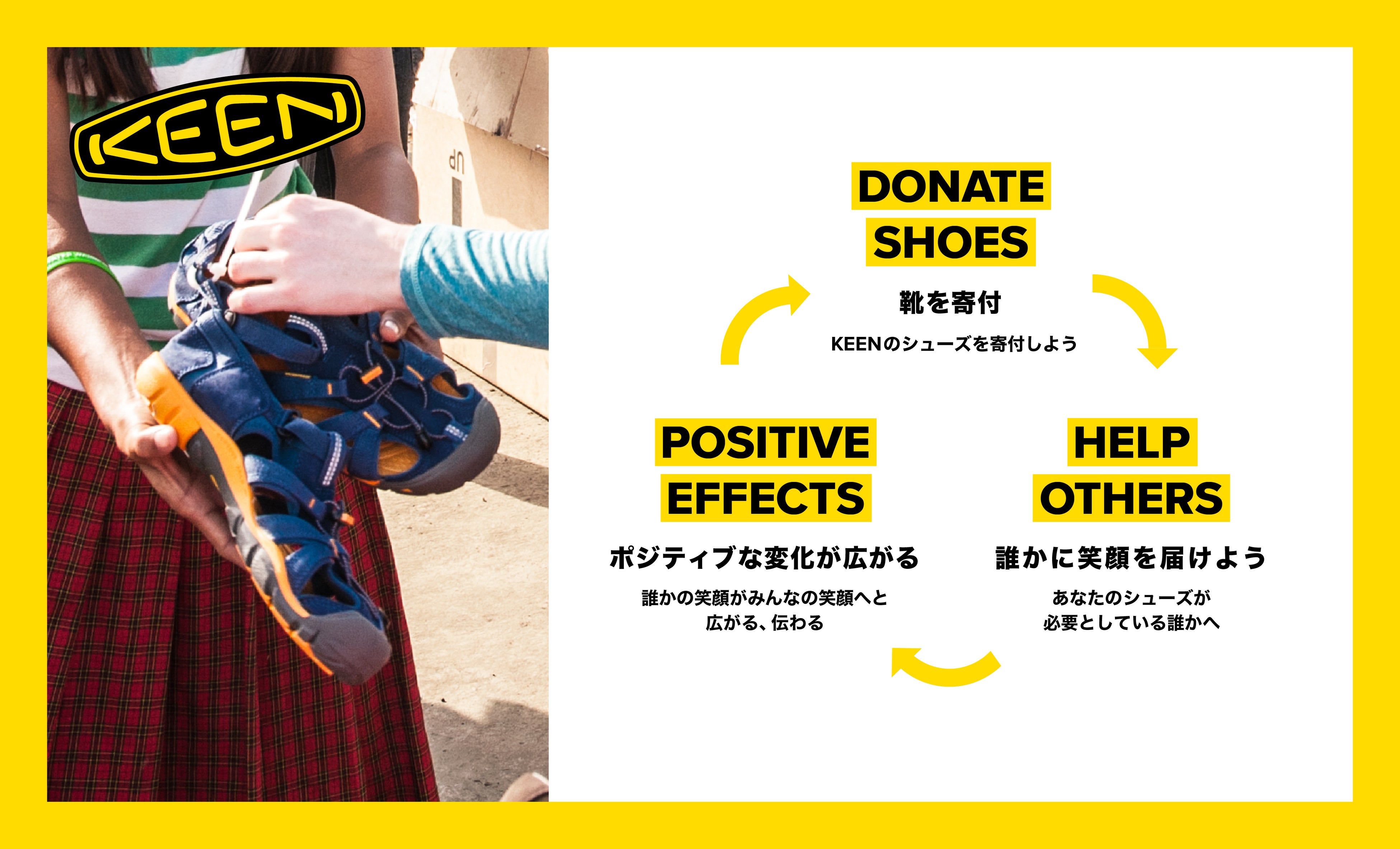 まだ履けるのに家で眠っているKEENのシューズ・サンダルをお預かりする「シューズドネーションボックス」を常設。お預かりしたシューズはKEEN EFFECTパートナー団体を通じ、靴を必要としている方に寄付させていただきます。できる限りキレイにしてお持ちください。