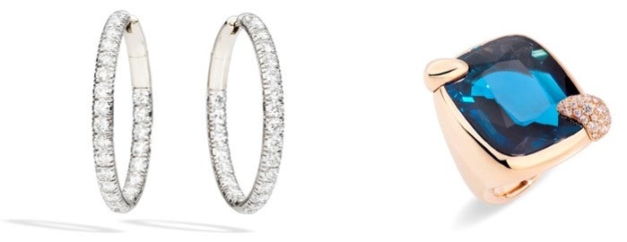 (左から):「カテネ」イヤリング K18WG×ダイヤモンド 2,882,000円、「リトラット」リング K18RG×ロンドンブルートパーズ×ダイヤモンド 1,408,000円