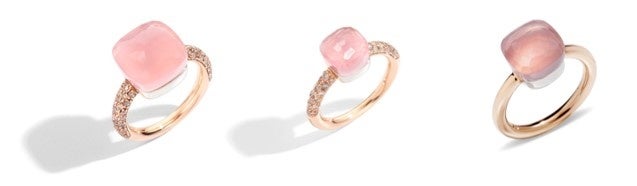 「ヌード」リング(左から):K18RG×K18WG×ローズクォーツ×カルセドニー×ブラウンダイヤモンド 616,000円、352,000円、K18RG×K18WG×ローズクォーツ 308,000円(税込)