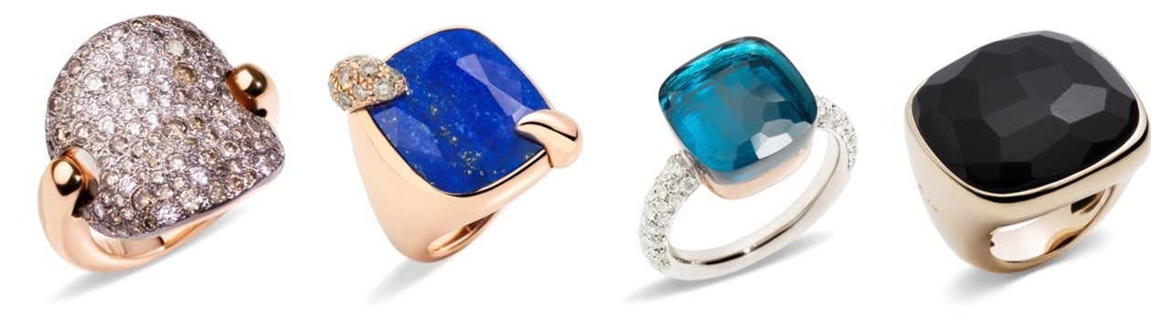 「リトラット」 K18RG×ラピスラズリ×ブラウンダイヤモンド 858,000円、「ヌード」 K18WG×K18RG×ロンドンブルートパーズ×ダイヤモンド836,000円、「ヴィクトリア」 K18RG×ジェット 803,000円(税込)