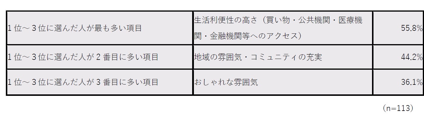 良い変化として考えられる20件の項目の中から、最も良い変化と感じられるもの上位3つを選んでもらう設問では、「生活利便性の高さ」に最も多くの票が集まり、また、1位から3位を総合した場合も「生活利便性の高さ」を最も多くの人が選びました。買い物や公共交通機関・医療機関・金融機関などの、日常生活に欠かせない場所へのアクセスが向上している点が「良い変化」として捉えられているようです。