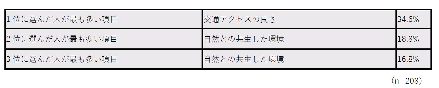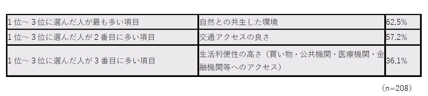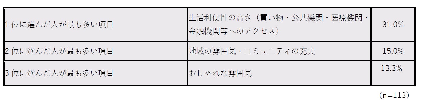 家賃・住宅価格/災害リスク上の安全性/教育機関の質/生活インフラの整備状況(水道・ガス・電気・ネットワーク)/居所の将来性や資産価値/新築住居の充実/子育てのしやすさ/高齢者の生活のしやすさ/学生生活のしやすさ/地域の雰囲気・コミュニティの充実/景観の美しさ/歴史や文化の魅力/静かさ・落ち着き/住民の温かさ/自然との共生した環境/おしゃれな雰囲気/社会的ステータス