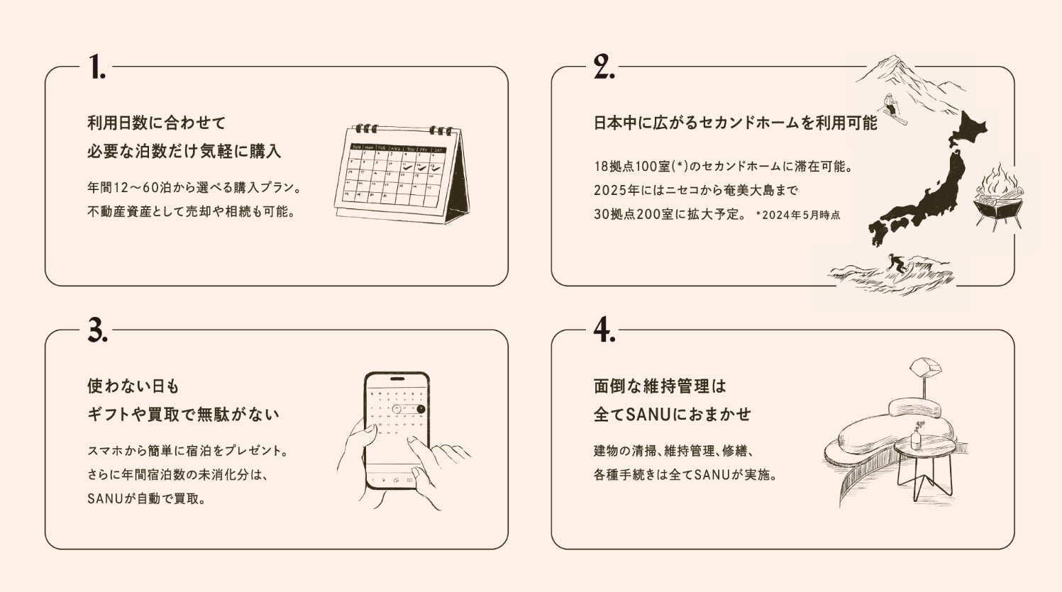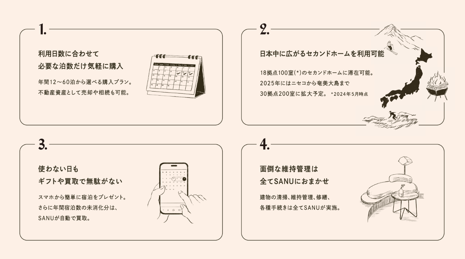 「SANU 2nd Home Co-Owners」では、年間12泊〜必要な利用日数に応じて所有権の比率を選び、共同オーナー = Co-Ownersになることで、別荘所有のネックでもあった大きな初期費用や維持管理の手間から解放されながら、日本中に広がるSANU 2nd Home(18拠点100室 *2024年5月時点 )をセカンドホームとして利用することが可能です。