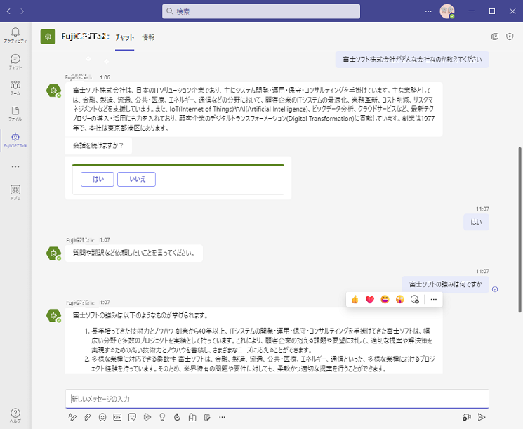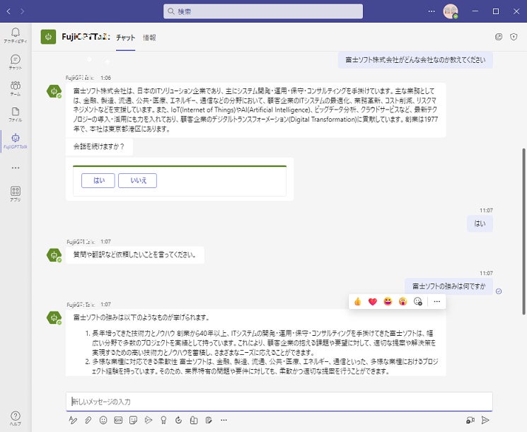 富士ソフトは長年、知能化技術・AIに取り組んでいます。また、MS関連サービスについても、長年にわたる日本マイクロソフト株式会社との協業を深めつつ、高い技術力と豊富な実績を当社の強みとしております。ChatGPTについてもいち早くサービス検証を開始し、効率的、効果的な活用方法の検討を進めてまいりました。現在、当社では、Microsoft 365とAzure OpenAI Serviceを活用した当社独自のChatGPT環境を構築し、約1万人の社内導入で検証を続けております。ChatGPTのようなプロンプトのスタイルで、Microsoft Teams上の対話のみで生成AIを利用できます。