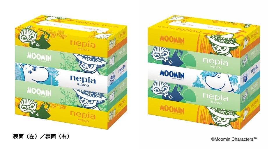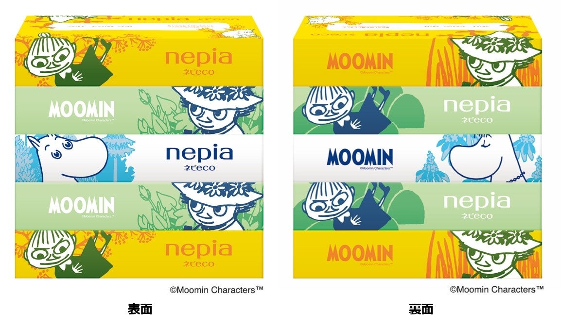 「ネピecoティシュ」は、取り出し口もフィルムの代わりに紙製、5コパック包装と取っ手にはバイオマスフィルム、パッケージのインキにはバイオマスインキを採用したサステナブルにこだわった商品です。この度、原料・商品規格からパッケージまで環境に最大限配慮したサステナブルな商品である「ネピecoティシュ」と、自然と共に生きる「ムーミン」の夢のコラボレーションが実現しました。