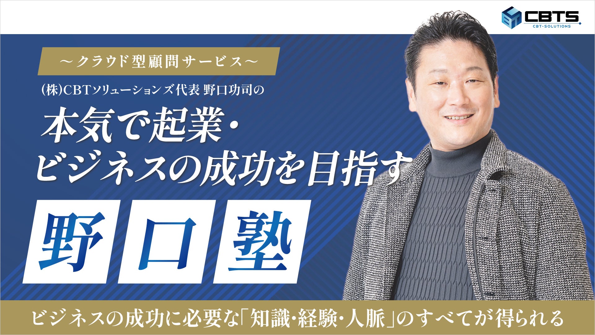 株式会社シー・ビー・ティ・ソリューションズ(本社:東京都千代田区、代表取締役社長:野口功司、以下CBTソリューションズ) の代表 野口が、起業特化型のクラウド型顧問サービス『野口塾』を開講します。