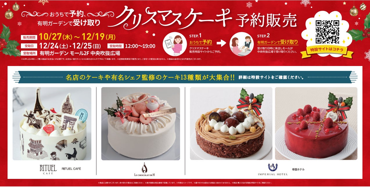 | イベント概要 クリスマスケーキ予約販売 予約期間:2022年10月27日(木)~12月19日(月) 受取日時:2022年12月24日(土)、25日(日)12:00~19:00 受取場所:有明ガーデン モール2F 中央吹抜広場 \予約特典/ クリスマスデザインのペーパーナプキンをプレゼント ▼有明ガーデンクリスマスケーキ予約販売の専用サイトはこちら http://ariakeevent.shop35.makeshop.jp/ |