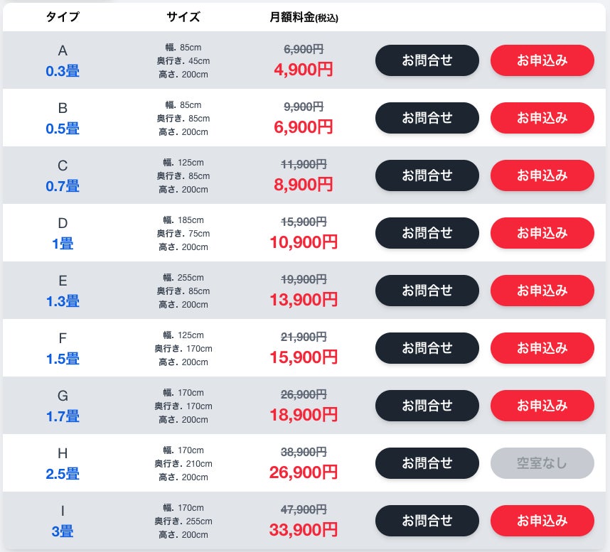 部屋タイプとサイズ、月額料金はこちら