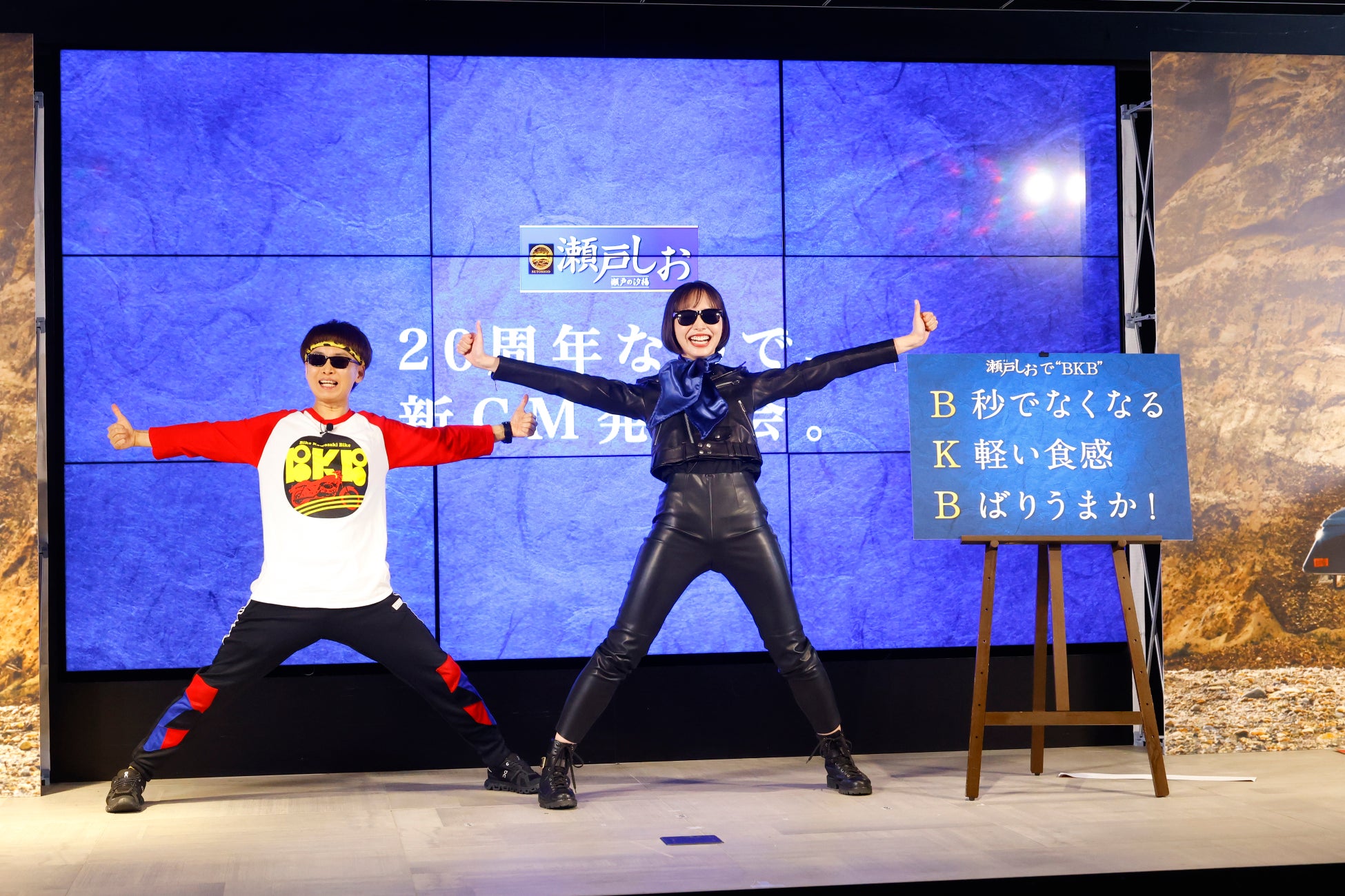 さらに、「20周年なので」瀬戸しおをより盛り上げるべく、井桁さんがベイカ栗山ベイカ(BKB)さんの持ちネタである、B・K・Bで瀬戸しおに関するあいうえお作文に挑戦。まずはベイカ栗山ベイカ(BKB)さんが、「ばりばり海老を感じる 軽やかで 美味なせんべい」とお手本を披露。お手本を見た井桁さんはサングラスをかけ、外見も含め準備万端。「秒でなくなる 軽い食感 ばりうまか! BKBヒィーヤ」と完全になりきって見せました。井桁さんはBKBについて「独特な開放感がありました。」と感想を述べ、表情に充実感を漂わせていました。