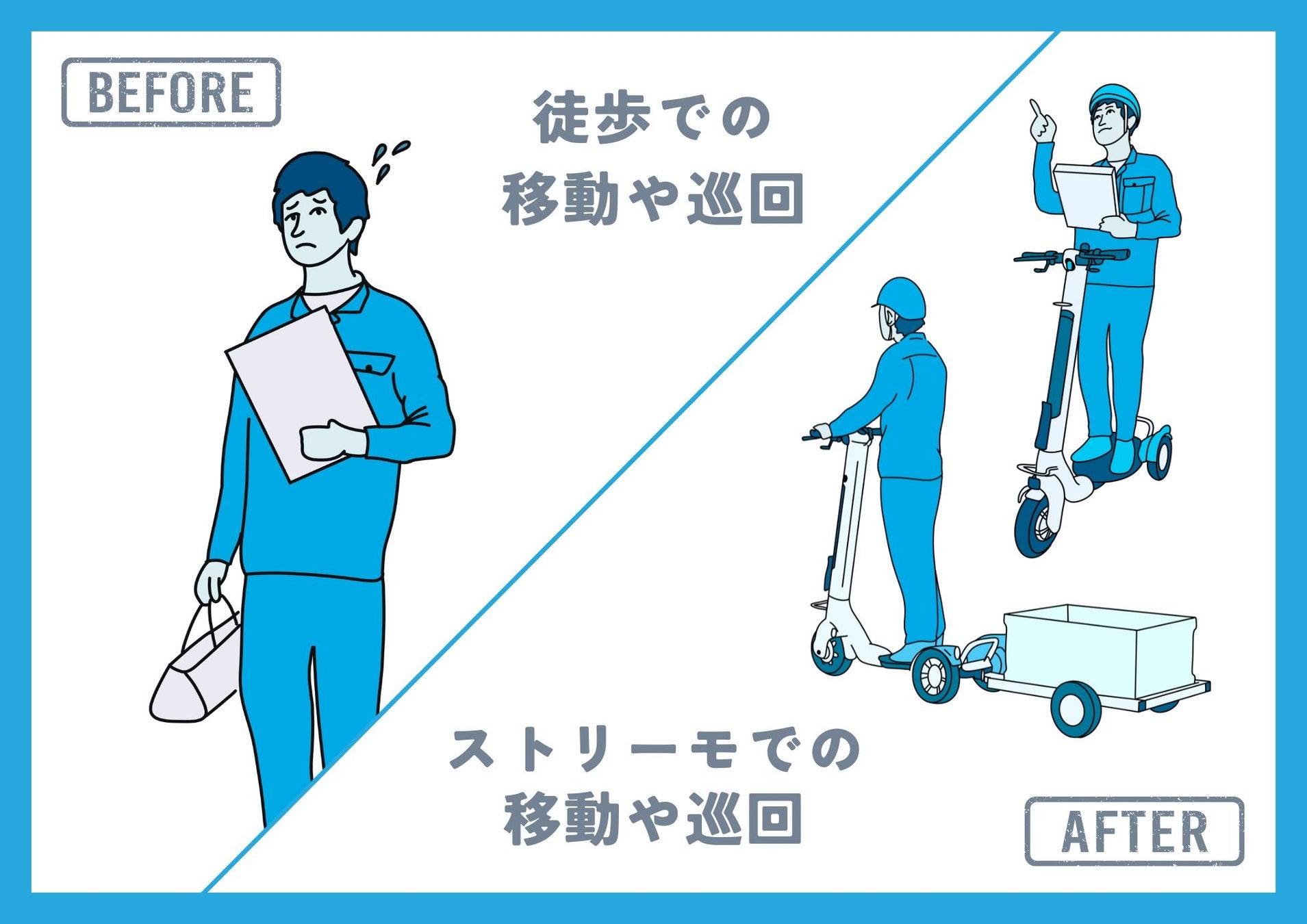 立乗り三輪モビリティ「ストリーモ」 による、建設作業所での職員の移動・巡視等の省力化、疲労・負担の軽減。年齢や性別にかかわらず、すべての人が個性や能力を発揮できる社会の実現に貢献。