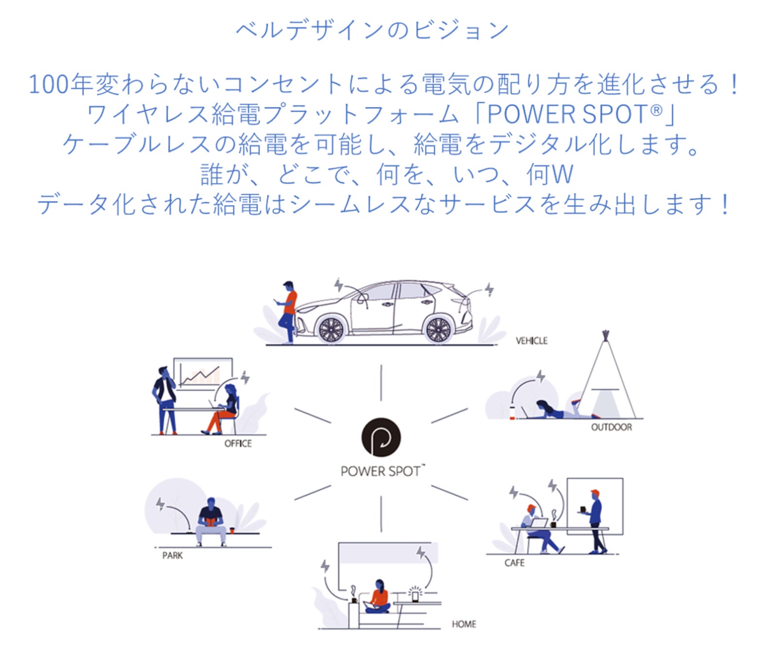 オフィスでの 50W ワイヤレス給電ユニット「 HOME 」による充電の利便性向上と、給電データを可視化し消費電力、利用時間帯、人数等を取得し分析することでデータの価値を創造。また 50W の送電力を生かし受電側のプロダクトの開発も行い、人々の働き方や暮らしの中に新しい体験を生む。