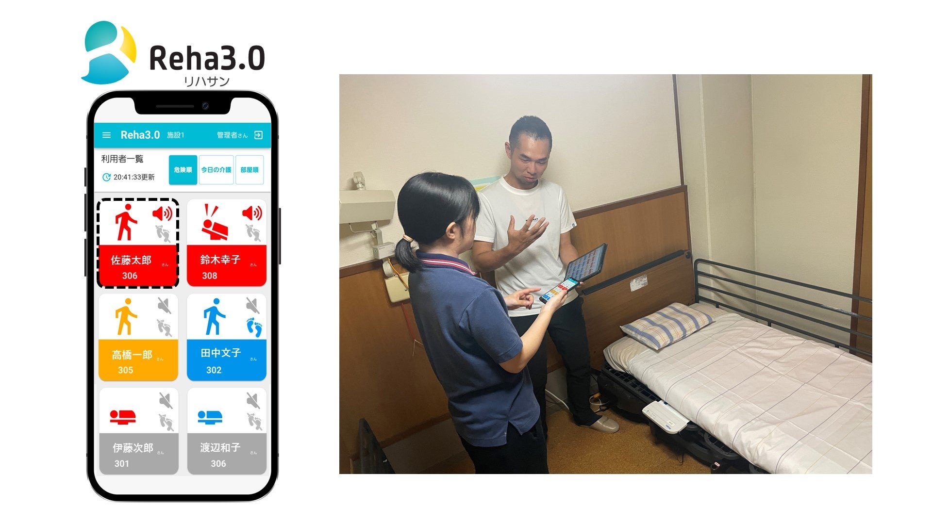 転倒ハイリスク者を可視化する「 Reha3.0(リハサン)」と見守りセンサー「アンシエル」を連携させ、見守り業務を 83% 削減し、夜間人員を 2 割削減。業務効率化とコスト削減を実現する革新的な介護 DX ソリューションを展開。