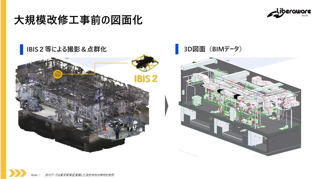国産ドローンメーカ Liberaware が開発する超狭小空間点検ドローン「 IBIS2 」と BIM( Building Information Modeling )を活用した、大規模改修工事における設計・施工 DX を推進。