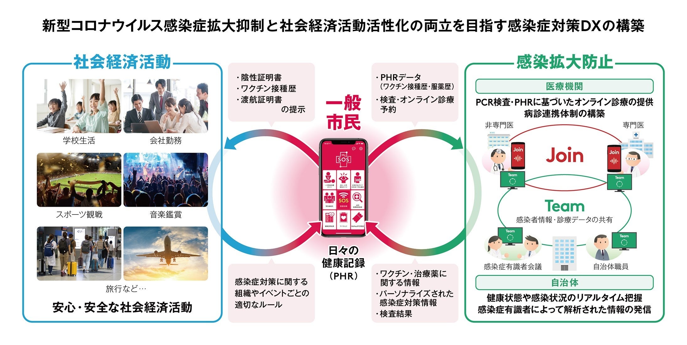 ① 医療提供体制の強化:発熱や咳などの症状があり新型コロナウイルス感染症が疑われる方に向けてPHR(Personal Health Record)に基づいたオンライン診療を提供する。専門医と非専門医をJoinで繋ぎ、診療相談ができる病診連携体制を構築する。