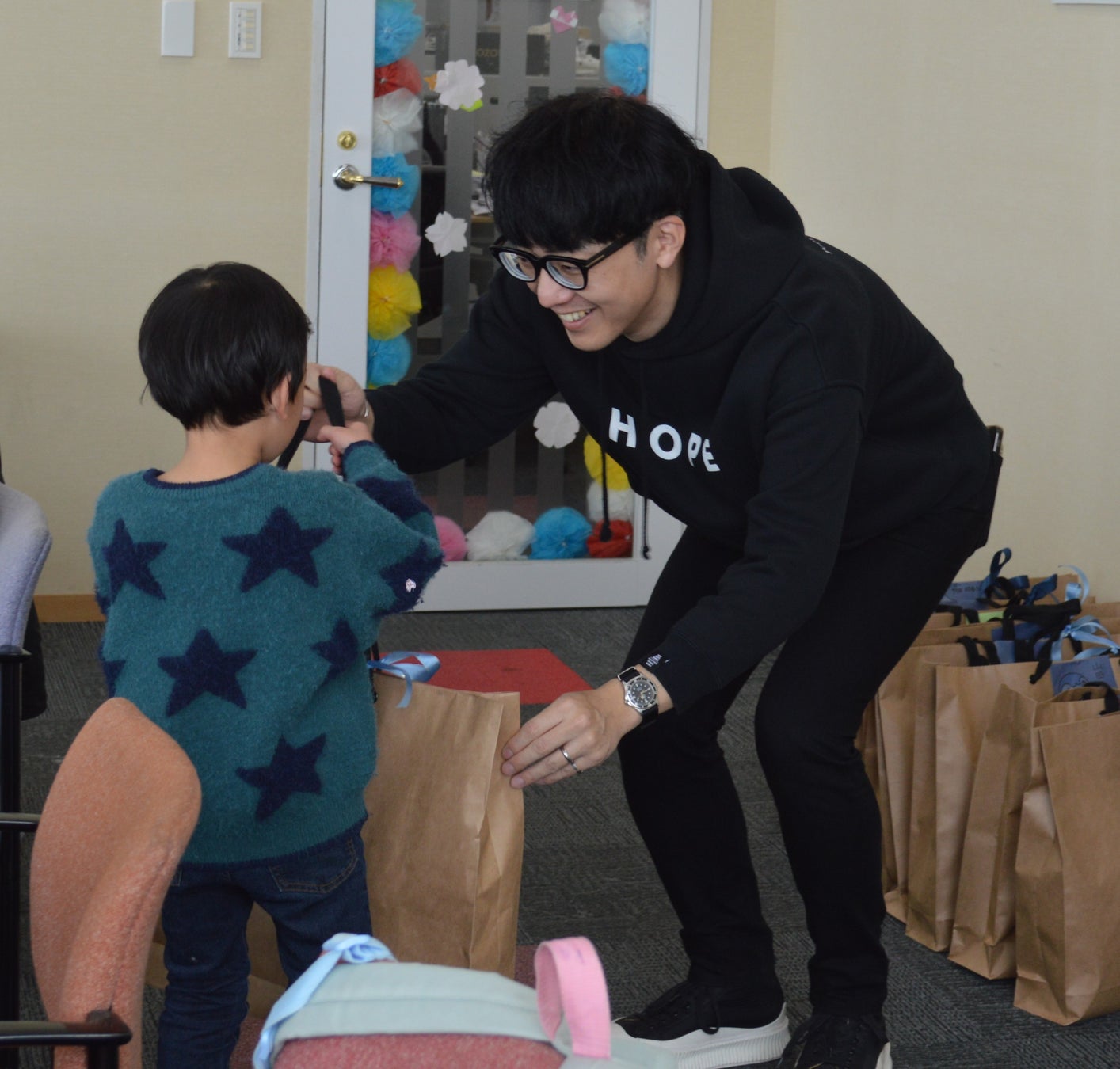 イベントの前半では、当社のTシャツを使用したエコバック作りや生地の端切れを使ったお花の飾りを作るワークショップを行い、子どもたちが思い思いに選んだTシャツや生地を使って世界で1つだけの作品を作った後、当社がフランチャイジーとして展開するコメダ珈琲の軽食を囲んで門出の日をお祝いしました。最後に一人ひとりに当社製のフォーマル服が手渡されると、子どもたちに笑顔が広がりました。