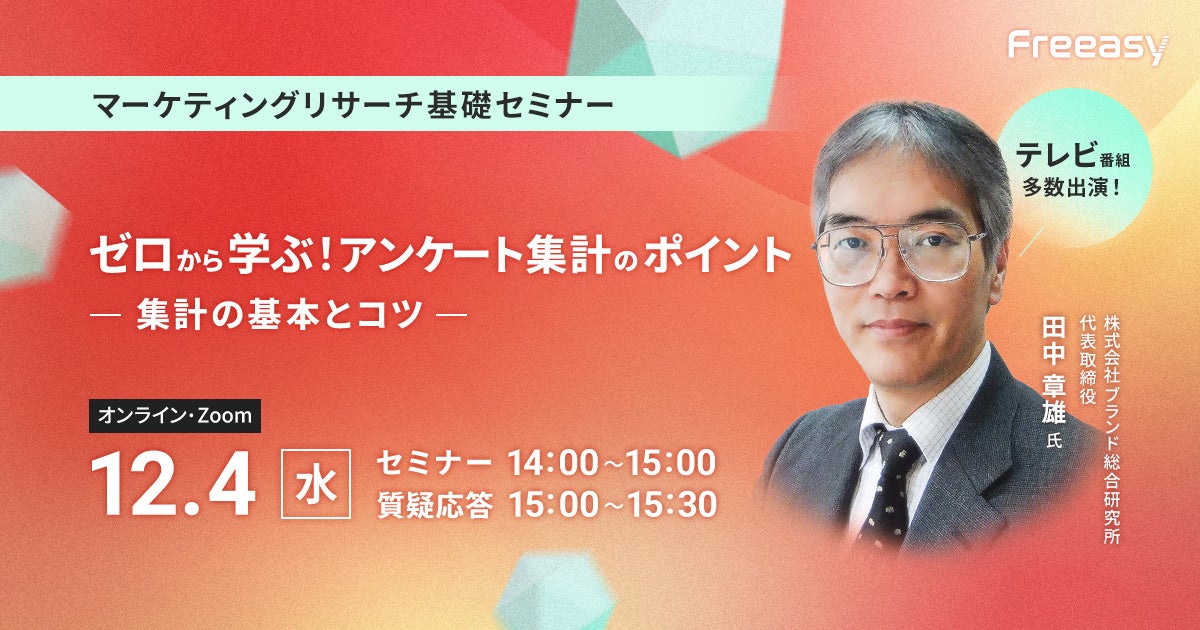 全国1,300万人の調査モニターへ、500円からネットリサーチが実施できる、セルフ型アンケートツール“Freeasy(フリージー)”を展開するアイブリッジ株式会社(本社:大阪市福島区、代表取締役社長:荒川和也)は、『マーケティングリサーチ基礎セミナー「ゼロから学ぶ!アンケート集計のポイント-集計の基本とコツ-」』を2024年12月4日(水)14時から開催いたします。